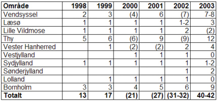 Trane antal ynglepar i Danmark, 1998-2003. Tal i parentes betyder at optællingen er lidt usikker, dvs. mere skøn end reel optælling.