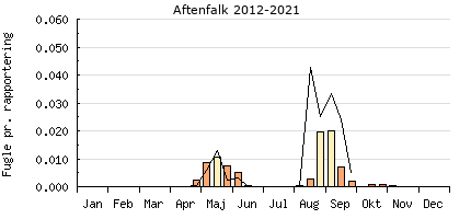 Forekomsten af Aftenfalk i Danmark, baseret på indtastninger i DOFbasen for 2012-2021.