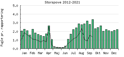 Forekomsten af Storspove i Danmark, baseret på indtastninger i DOFbasen for 2012-2021.