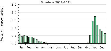Forekomsten af Silkehale i Danmark, baseret på indtastninger i DOFbasen for 2012-2021.