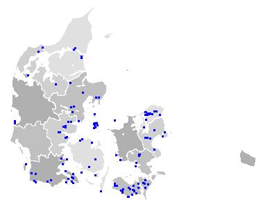 • Lokaliteter med ynglepar (blå) og observationer (rød) med Rørhøg i 2008 indtil videre: